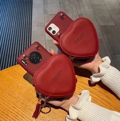 <大きなハートが目を引く、おしゃれで便利なiPhoneケース。カード、リップ、イヤホンも一緒に持ち運べる、まるで小さなバッグのような多機能デザイン>