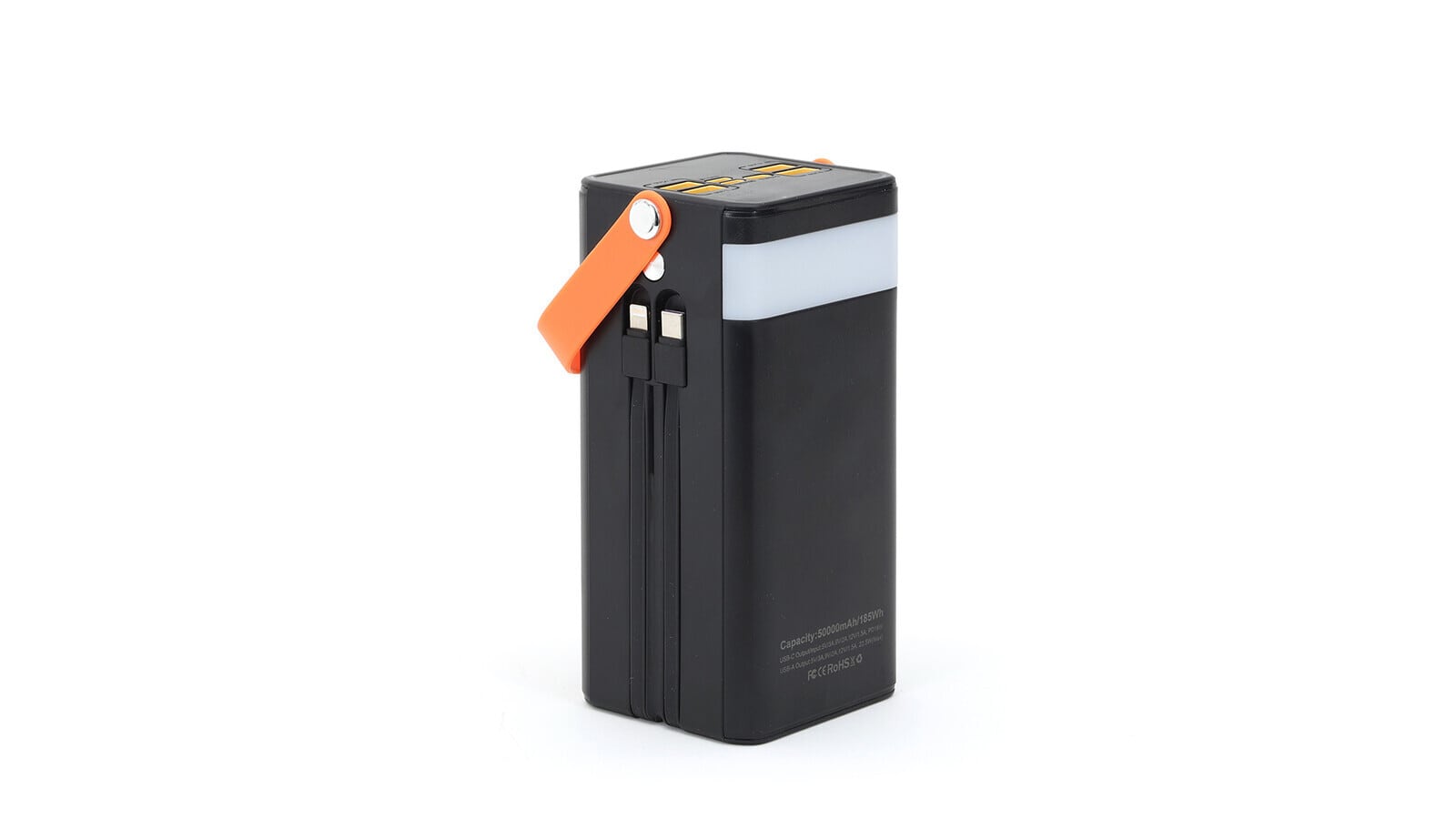 バッテリー容量:50,000mAh、出力電力:最大22.5W(各出力ポート合計)、ポート数:USBType-A×4・Type-C×1・Micro×1・ライトニング×1の最大7箇所、入力:DC5V・2A/DC5V・4.5A、出力:DC5V・2A/DC5V・4.5A、入力ポート:USBType-A×1・TypeC×1・Micro×1・ライトニング×1、出力ポート:USBType-A×4・Type-C×2、ライトニング×1
