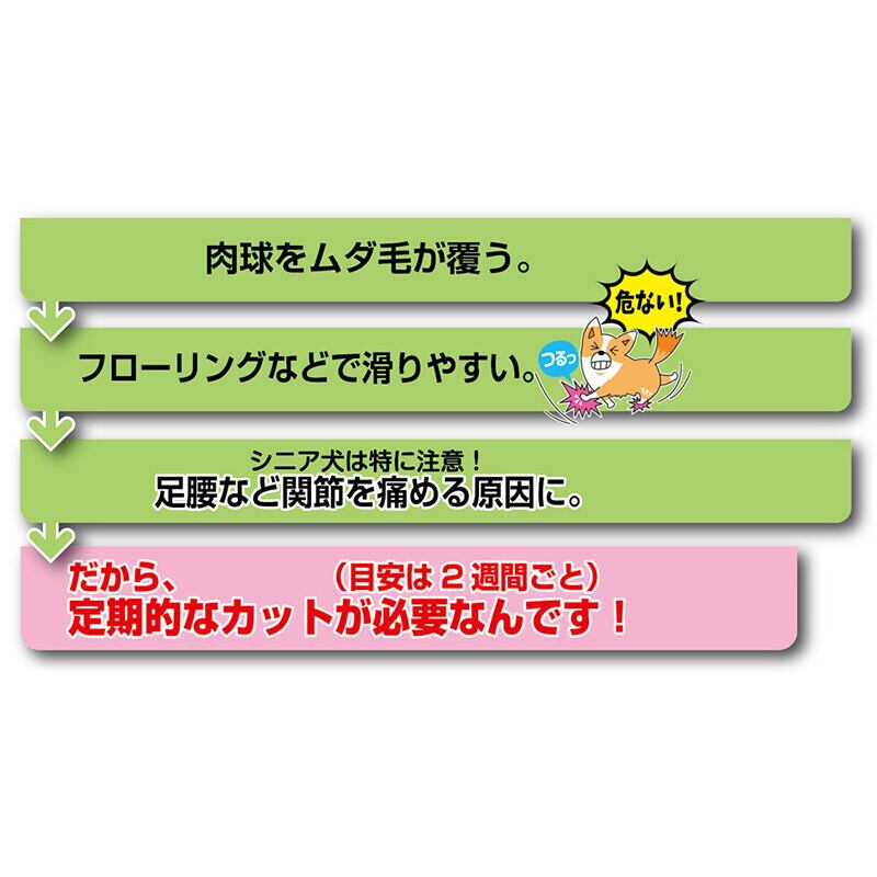 ・肉球まわりのムダ毛は、定期的にカットを!シニアや長毛種はもちろん短毛種も要注意、小石などの巻き込みにも強く、刃こぼれしにくいステンレス(金属刃)、ペット美容専用カット刃、乾電池式(単3形アルカリ乾電池×1本使用)