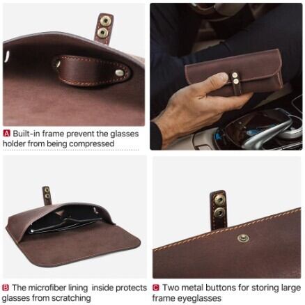 ケースの内側は、柔らかなマイクロファイバー生地でデリケートなレンズやフレームを傷やホコリから優しく守ります。外側の頑丈な革と内部の堅牢な構造が連携し、不意の衝撃からも大切なメガネをしっかりと保護。安心して持ち運べます。