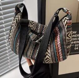 日常にボヘミアンな彩りを加えたいあなたへ。このトライバルスタイル ショルダーバッグは、個性的でエスニックなデザインと、使いやすさを両立させたクロスボディバッグです。しっかりとしたキャンバス地の織物とスムーズなジッパー、そして内側の機能的なポケットで、お出かけがもっと楽しくなります。