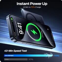 USB Type-Cポートからの有線充電は、最大20WのPD急速充電に対応。対応デバイスをわずか40分で70%まで充電するなど、驚きのスピードでパワーアップします。さらに、Magsafe対応デバイスへは最大15W(7.5W/10W/15W自動調整)のワイヤレス充電を提供し、素早く効率的な充電を実現します。