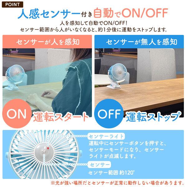 センサー付きクリップファン USB/ソーラー充電 急速冷却 人感センサー 多機能アウトドアギア キッチン 洗面所 トラック フォークリフト ガレージ アウトドア キャンプ NS