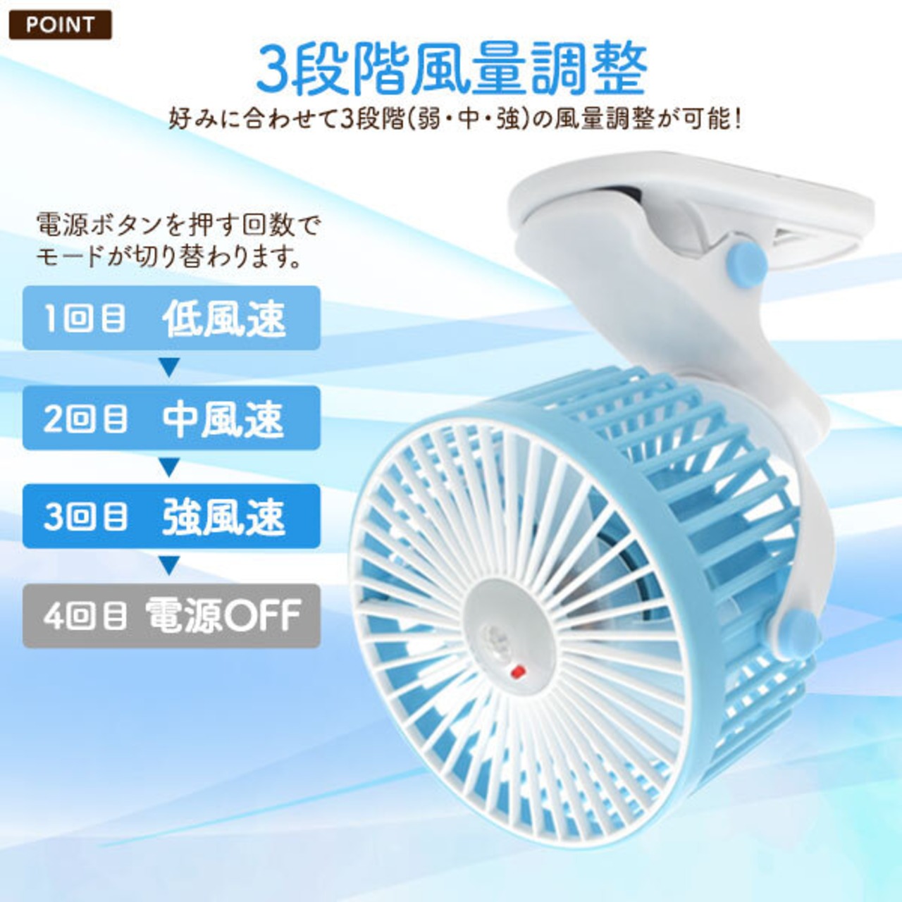 好みに合わせて3段階(弱・中・強)の風量調整が可能!