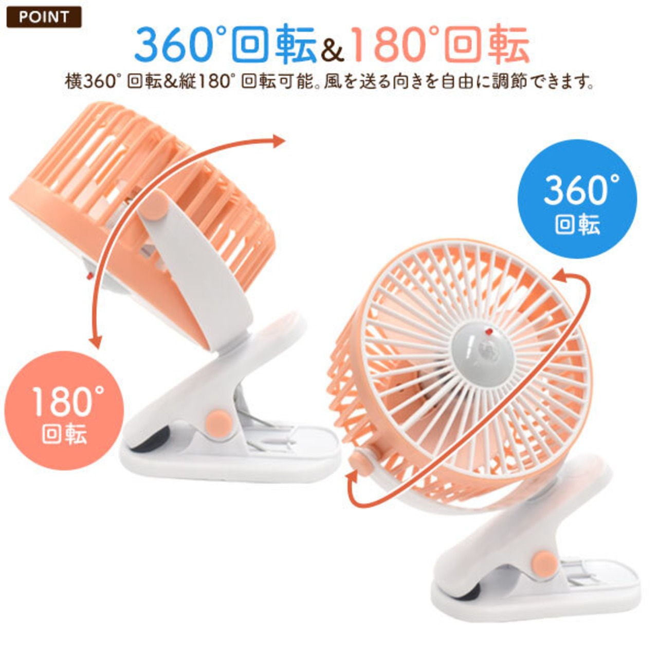 横360°回転&縦180°回転可能。風を送る向きを自由に調節できます。
