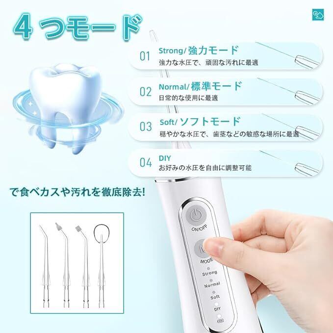 ジェット水流で歯の間に詰まった食べかす除去可能です。(ご注意:初心者、子供、歯茎が弱い方はソフトモードをお勧めします。)