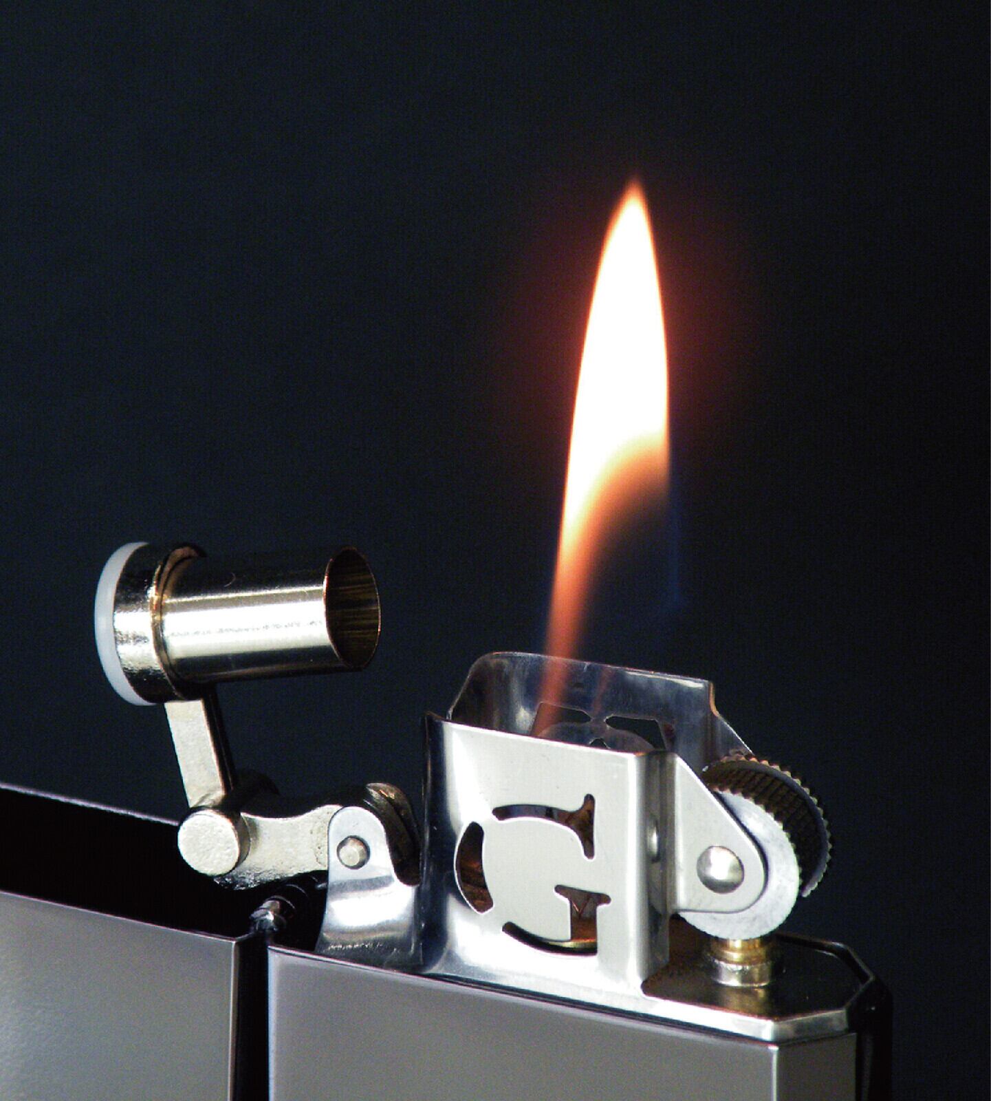 一般的なオイルライターの約1.5倍となる、厚み約0.6mmの外ケースを採用。手に取った瞬間にわかるずっしりとした重みと、重厚感のある仕上がりは、単なる道具を超えた所有する喜びを感じさせます。また、厚みがあることでより深い彫刻が可能になり、細かなデザインも美しく表現できるのが強みです。