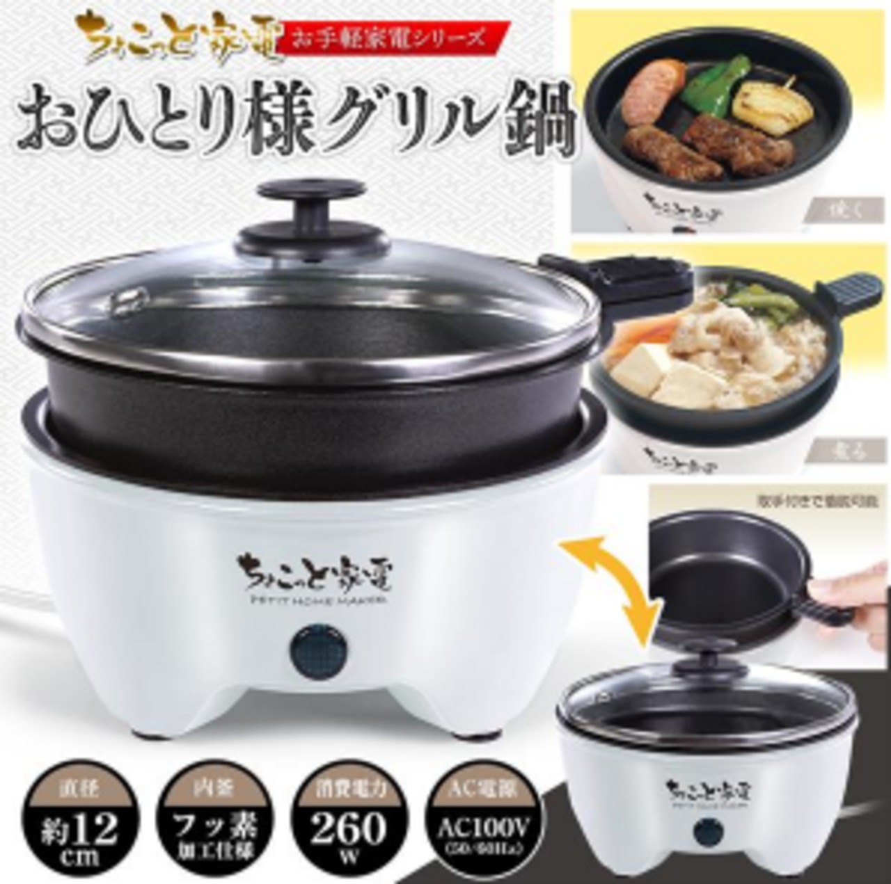 一人用グリル鍋 電気鍋 12cm 着脱式なべ 電気なべ ガラス蓋 卓上鍋 一人暮らし 調理器 一人用電気鍋 NS