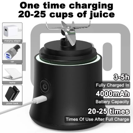 Type-C充電に対応し、PCやモバイルバッテリーからでも充電可能。4000mAhの大容量バッテリーで、1回の充電で約10〜12カップ分のジュースが作れます。