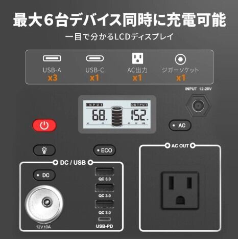 【5Way出力&合計7口】純正弦波AC(100v)出力(2口)、USBQC3.0(3口、合計54w、それぞれ18w)、60WPD3.0 Type-C出力(5-20V、最大3A)、シガーソケット(12v、10A)出力(1口)と合計8口が揃えて、出力方によって別なスイッチでコントロールができます。急速充電機能搭載のQC3.0USBポートは18Wの出力で、普通のUSBポートより充電速度を2倍となります。最新型ナ液晶表示デザイン、バッテリ残量の利用可能な時間が自動計算して一目で見えます、面倒な計算入りません。台風、地震や津波など停電日に非常電源用としてもちろん、車中泊などのキャンプ用電源としても最適です。