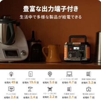 【大容量520Wh】520whの大容量ポータブル電源、最大600Wの機器に給電でき、幅広くの設備や端末に対応できます。LEDライトやSOS機能も付きますので、キャンプから防災まで幅広く活躍できます。ノートパソコン(50W)が約10回、スマホ(12W)が約43回、Switch(18W)が約28回、Goproは約100回充電できます。ACコンセントは純正弦波を採用しており、電気クッカーなど600Wまでの家庭用機器に問題なく利用できます、いざというときに最低限の生活ができる分の家電は確保できます。パススルー充電対応なので、電源に充電しながら給電も出来ます。