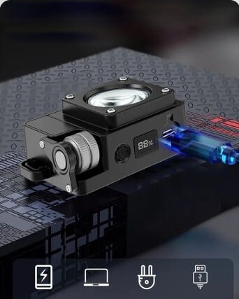 〇便利なスマートディスプレイ: デジタルパワーインジケーターでバッテリー残量を瞬時に確認できます。また、電源OFF時には夜光ガイド(緑色LEDビーズ)が暗闇で光り、ライトの場所を簡単に特定できます。