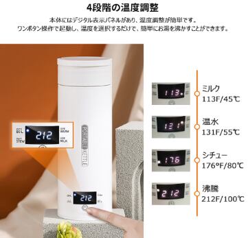 ・カスタマイズ可能な温度設定: 45℃(ミルク/美容)、55℃(ハーブティー)、80℃(コーヒー)、100℃(完全沸騰)の4段階温度設定が可能。飲みたいものに合わせた最適な温度をボタン一つで選べます。