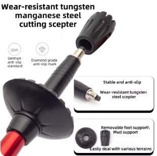 タングステンチップ&滑り止めフット: 先端のタングステンチップと、耐久性のある滑り止めフットサポートにより、岩場や泥道、雪道など、さまざまな地形での滑りや転倒を防ぎます。