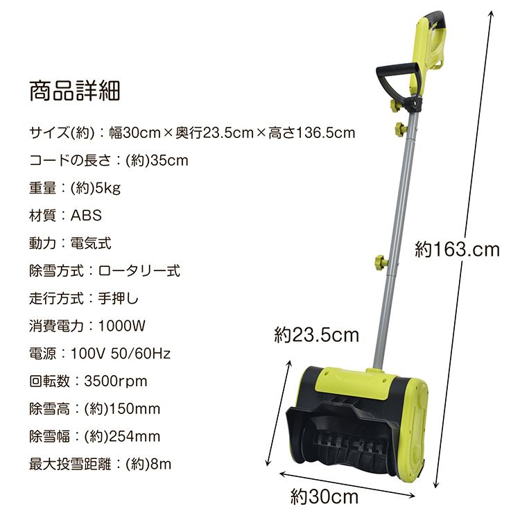 電動除雪機 家庭用コンセント給電 ロータリー式除雪 手押し 最大投雪距離8m 1000W 軽量設計 折りたたみ NS