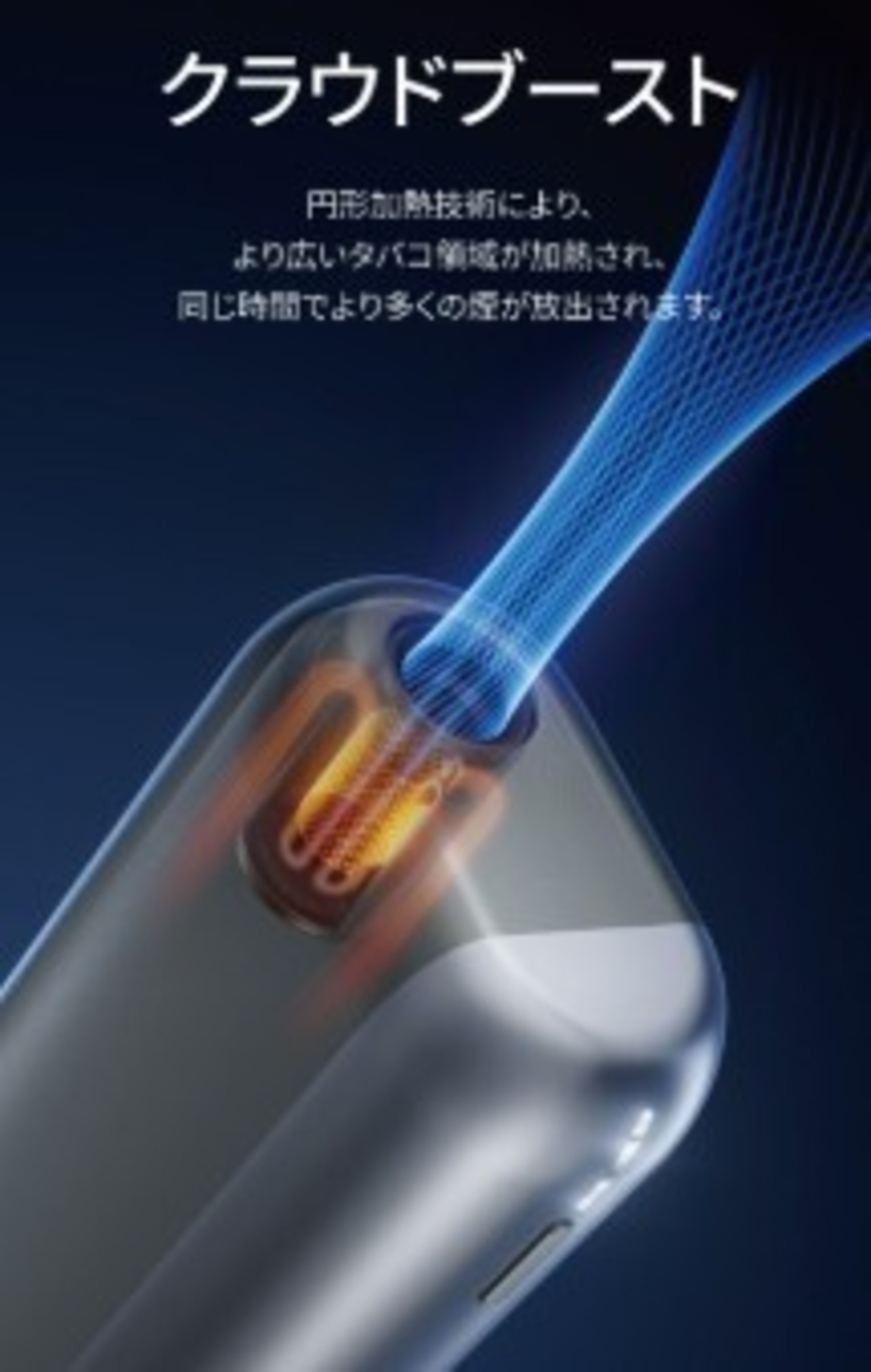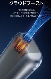・クラウドブースト:円形加熱技術により、より広いタバコ領域が加熱され、同じ時間でより多くの煙が放出されます。