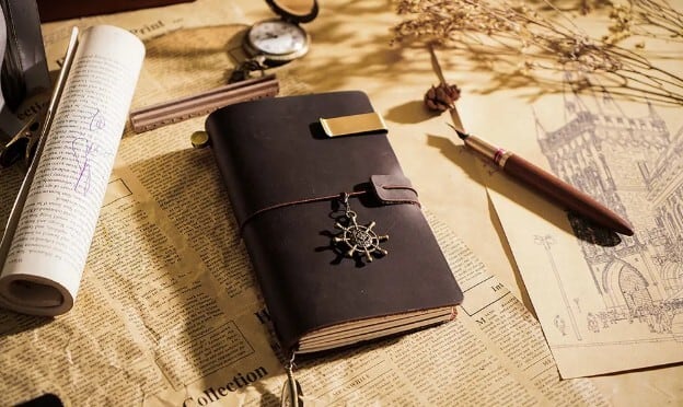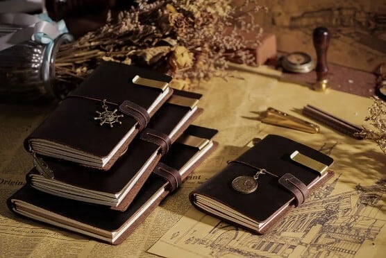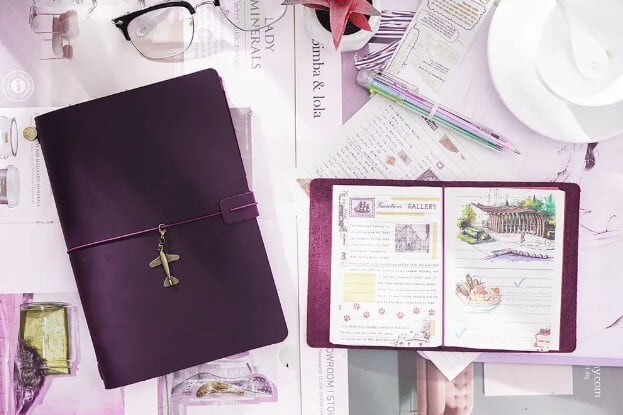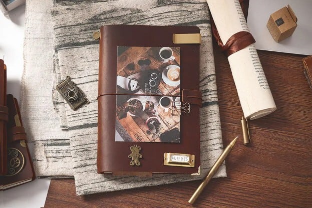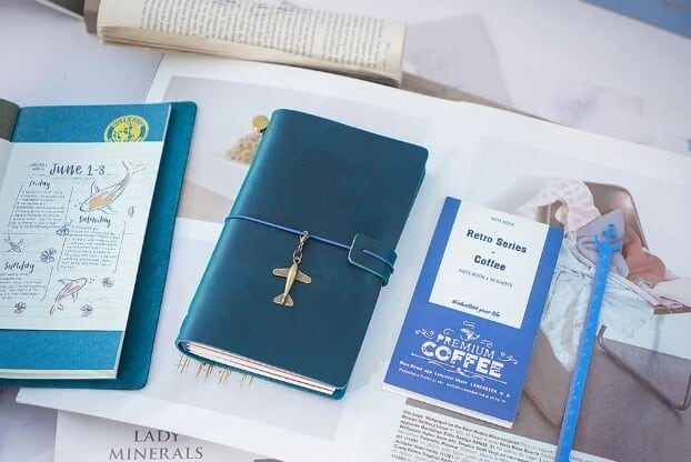 ・ 旅行日記(トラベラーズノート):飛行機のチャームと共に、旅先の思い出やスタンプを集める相棒に。