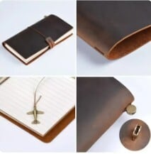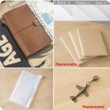 ・ 内容品:レザーカバー本体、ノートリフィル3種(無地・罫線・方眼)、PVCジッパーポケット、飛行機チャーム