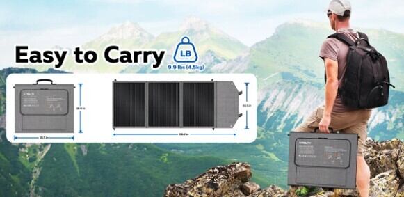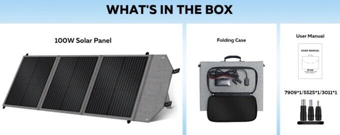 付属のSP100ソーラーパネルは、単結晶シリコン182チップを採用。23%という高い変換効率を実現し、太陽光を効率よく電力に変換します。折りたたみ式でブラケットも装備しており、設置も持ち運びも簡単です。