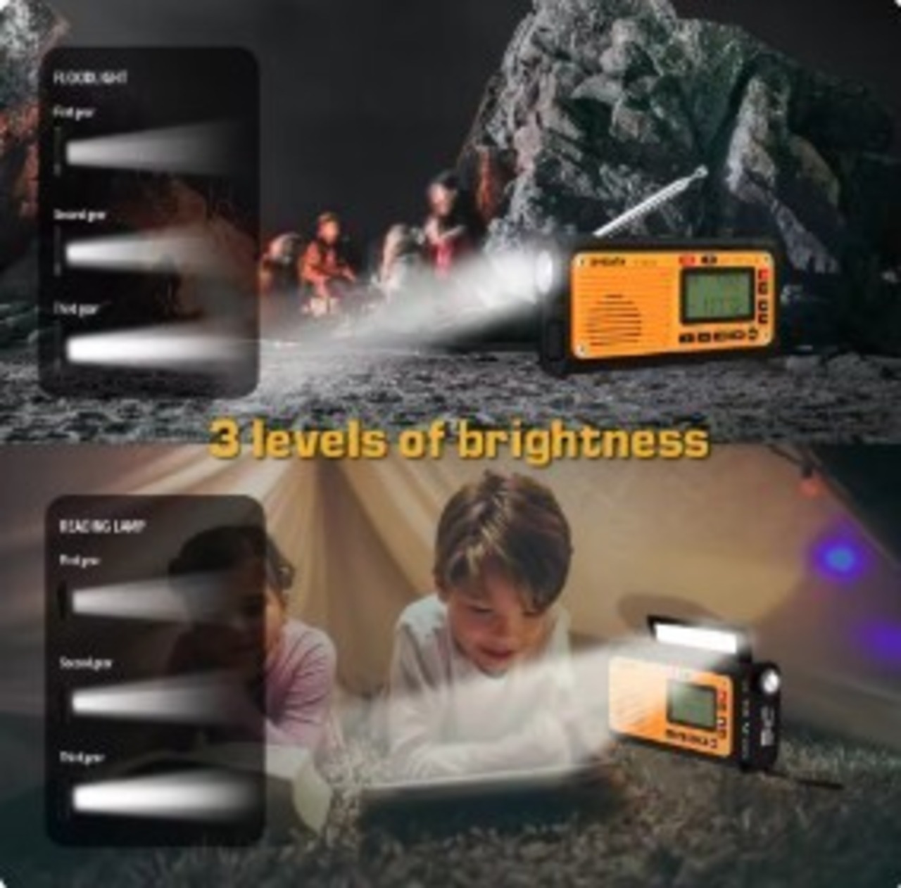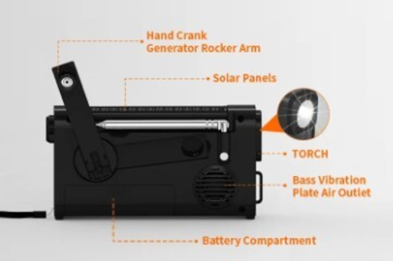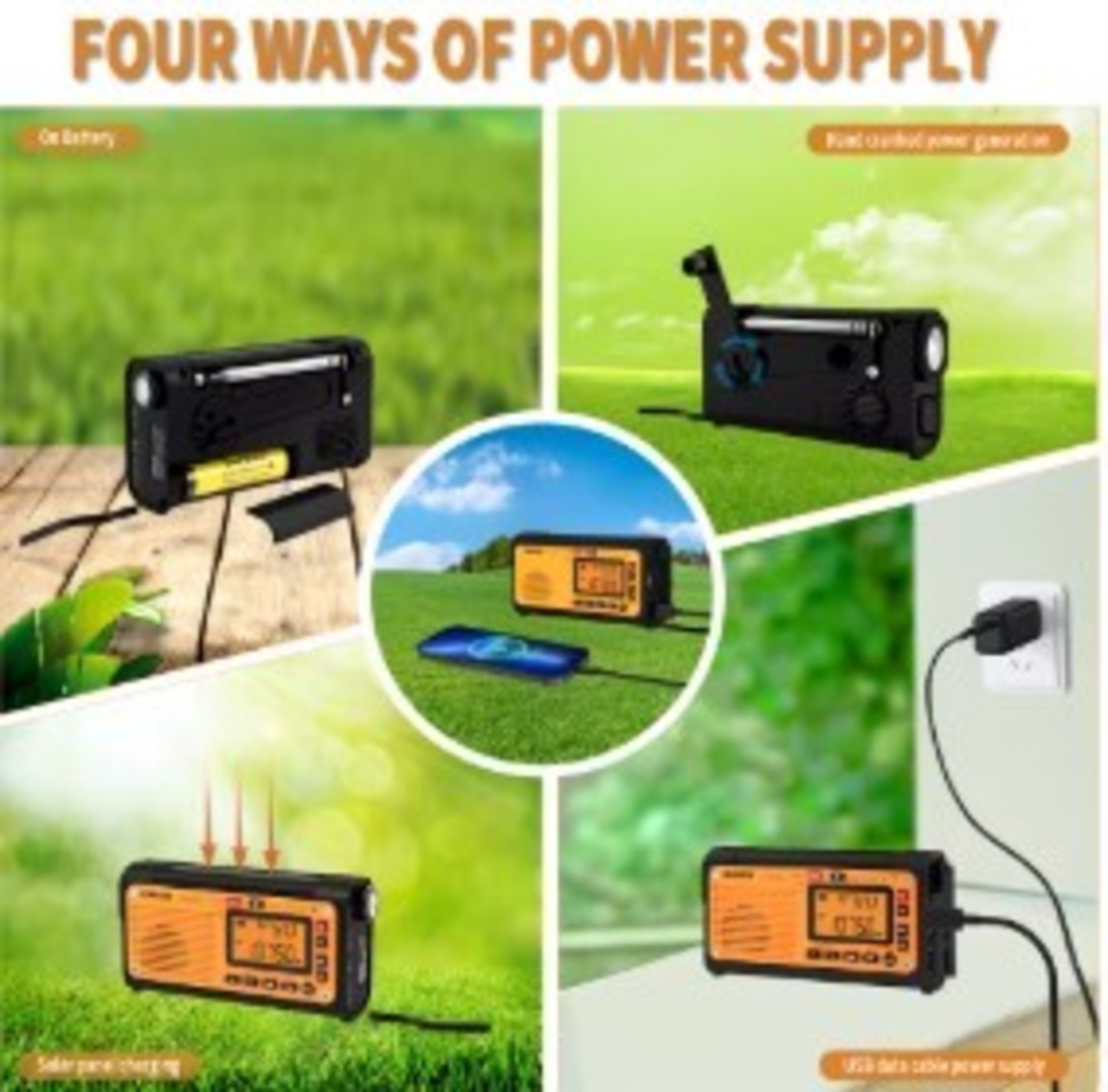 3000mAhの充電式バッテリーを中心に、Type-C充電、ソーラーパネル、ハンドクランク(手回し発電)の4つの電源オプションを装備。停電時でも電源を絶やすことなく情報を入手でき、スマートフォンの充電も可能なパワーバンクとしても機能します。