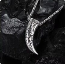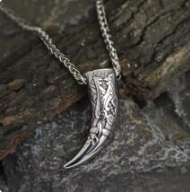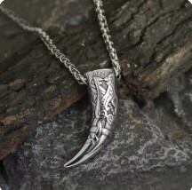 北欧の凍てつく森を駆け、最高神オーディンに付き従った聖なる獣、オオカミ。その鋭い牙(ウルフファング)をモチーフにしたこのペンダントは、古来よりバイキングたちが「勇気」と「結束」の証として、また獲物を狩るための「力」の象徴として身に着けてきたお守りです。幾何学的な文様が刻まれた重厚なデザインは、遥か時代の戦士たちが抱いた不屈の魂を、現代を生き抜くあなたの胸元へと呼び覚まします。