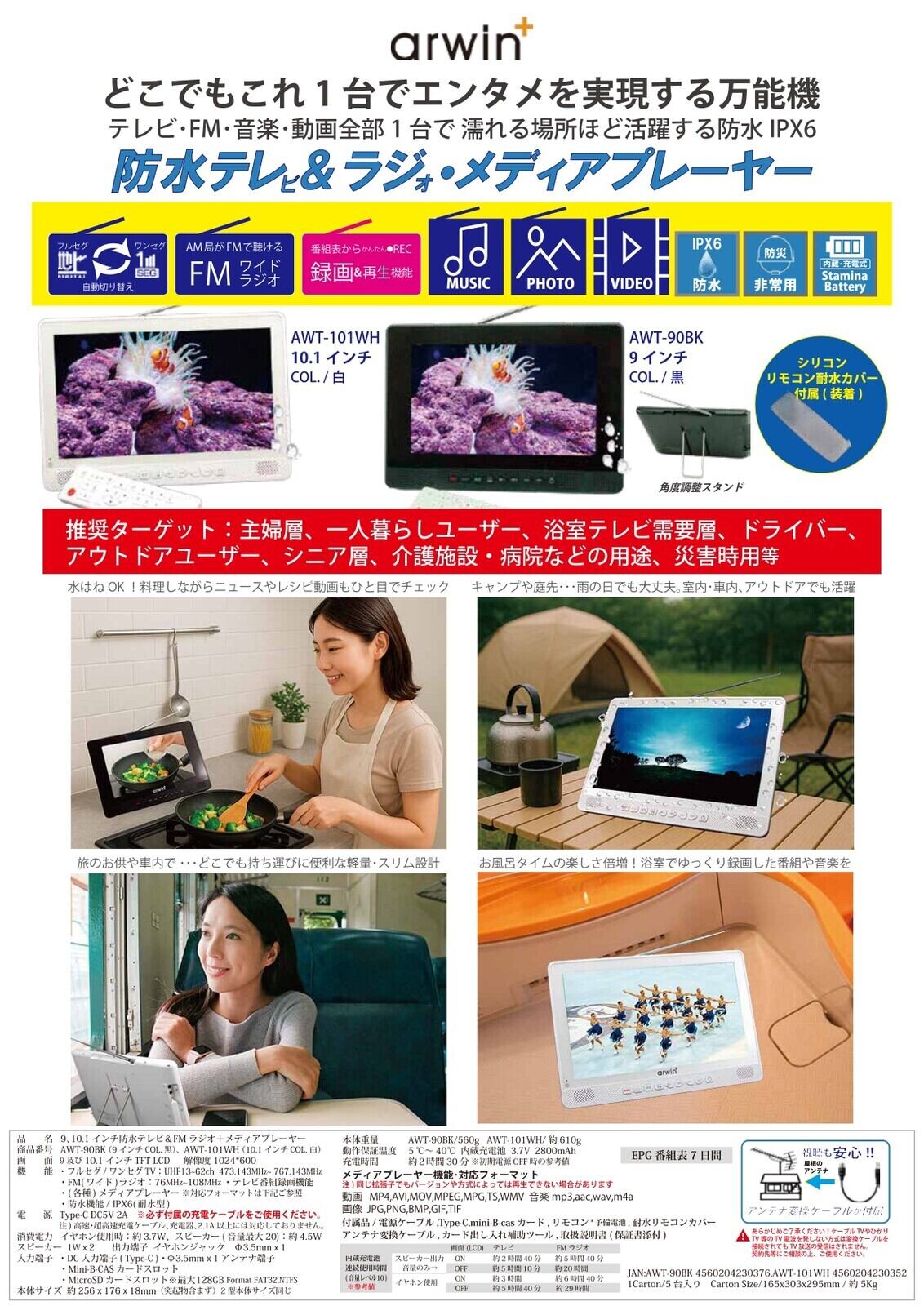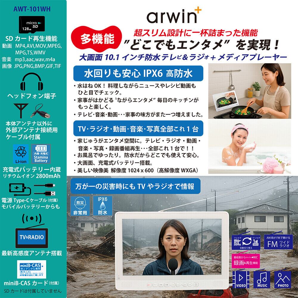 【NEW】 10.1”防水テレビ・FMラジオ・メディアプレイヤー どこでもエンタメ カンタン予約 あんしん防水 単身 入院 介護 ドライブ 機内 SD 【大口歓迎】