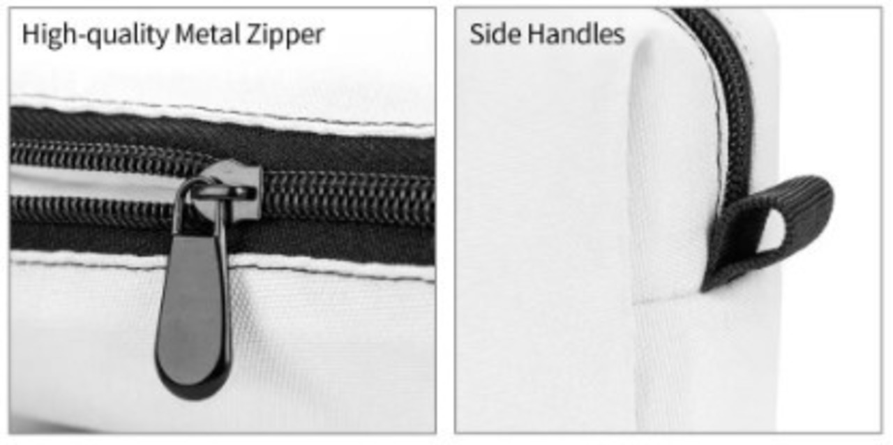 耐久性に優れた高品質(HQ)メタルジッパーを採用。開閉がスムーズで、ストレスなく中身を取り出せます。サイドには持ち運びに便利なハンドルが付いており、外出先での持ち運びやバッグからの取り出しもスマートです。