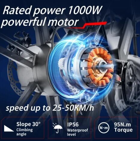 最大出力1000Wのモーターが、最高速度約50km/h(31mph)の力強い走りを実現。静音性に優れながらも、急な坂道やオフロードの難所を軽々と征服するトルクフルな加速は、一度体感すると忘れられない爽快感を提供します。
