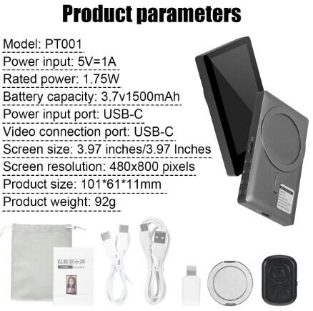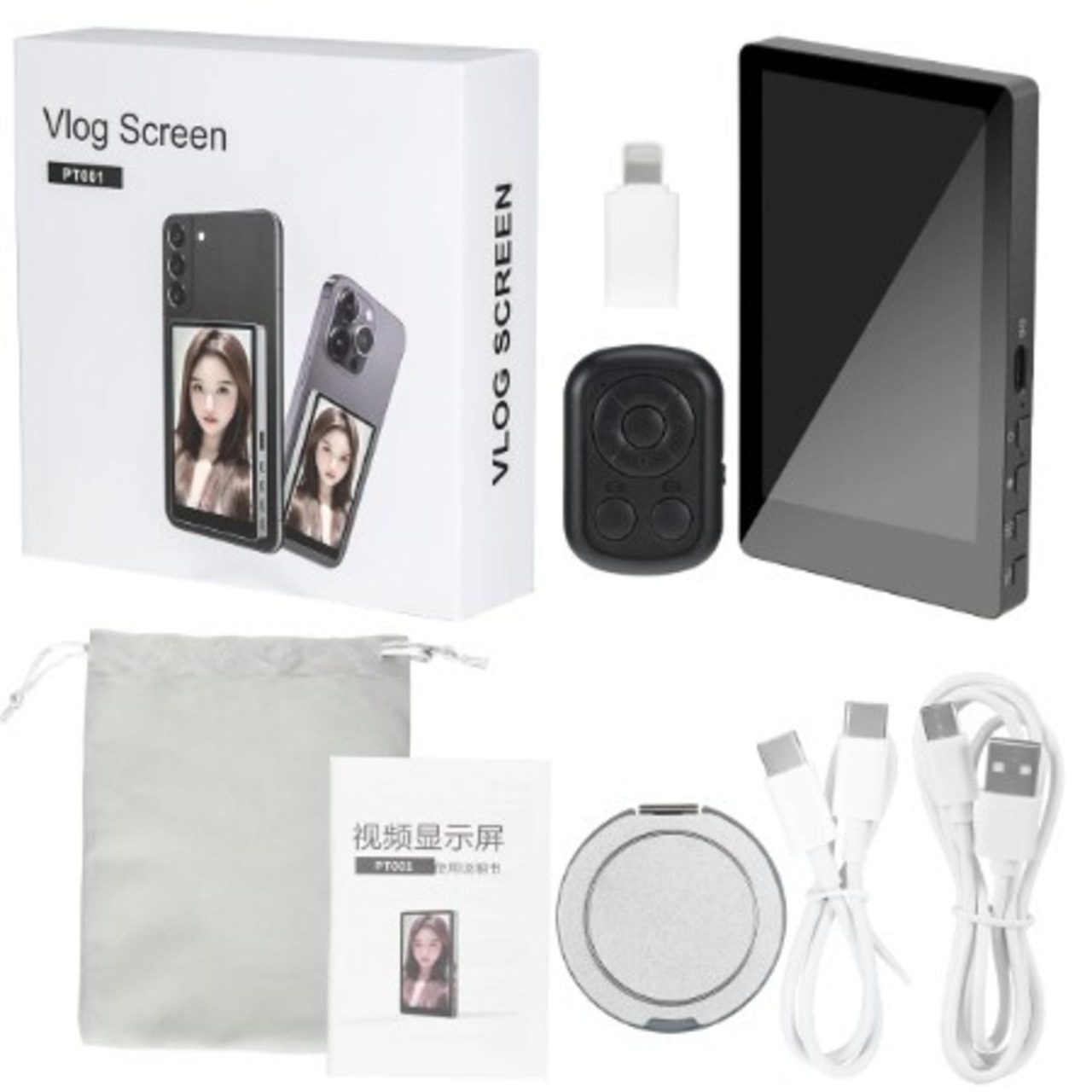 自撮りモニター本体 × 1、専用収納バッグ × 1、Bluetoothリモコン × 1、USB充電ケーブル × 1、折りたたみ式磁気リング × 1、アダプター × 1、取扱説明書