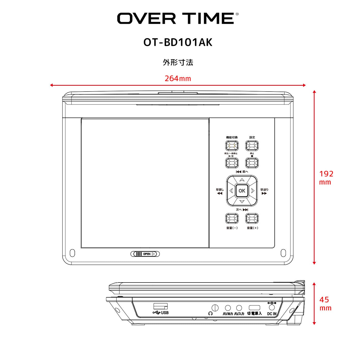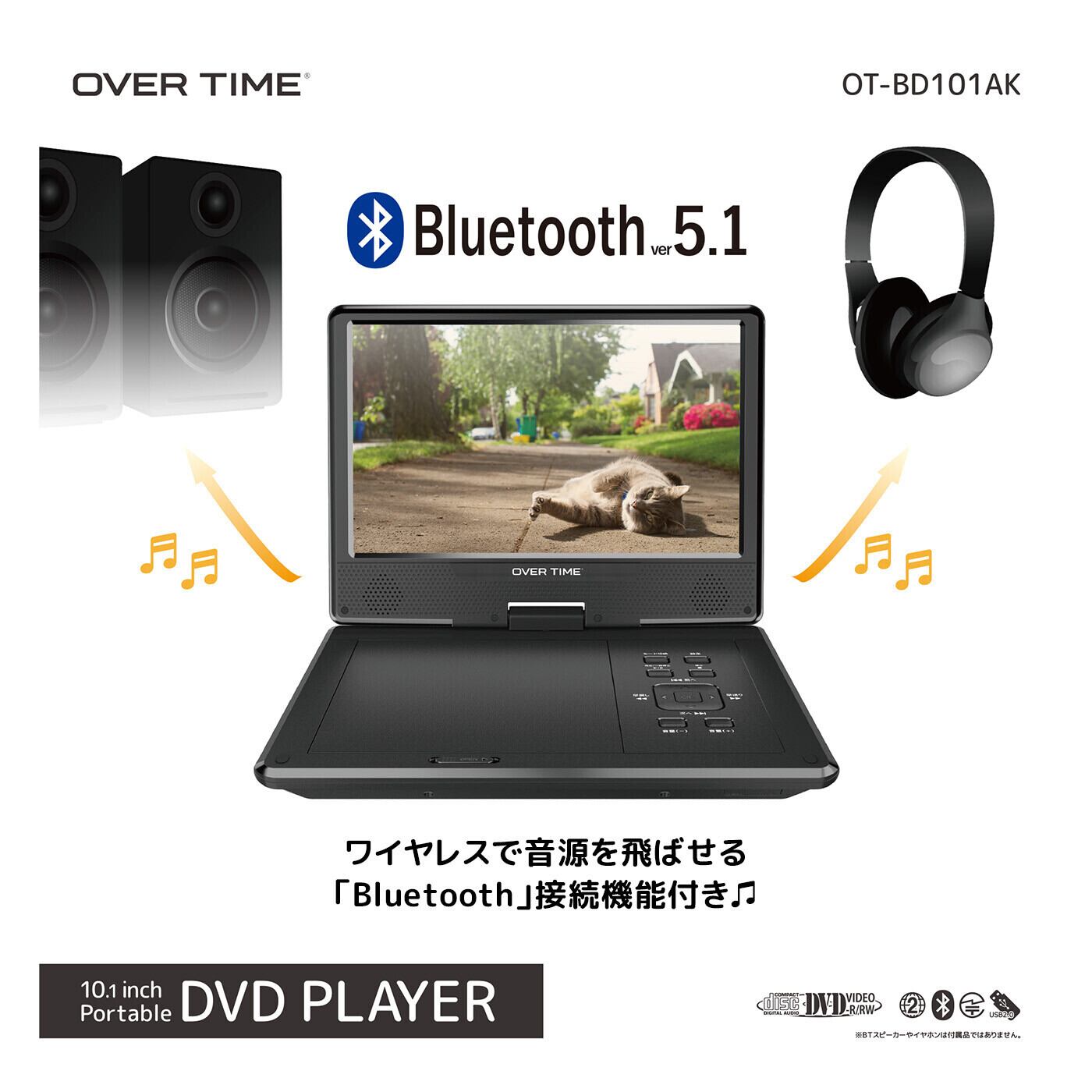 OVER TIME Bluetooth搭載10.1インチ ポータブルDVDプレイヤー OT-BD101AK BTスピーカー CDリッピング録音 3電源方式 メディア再生 SD