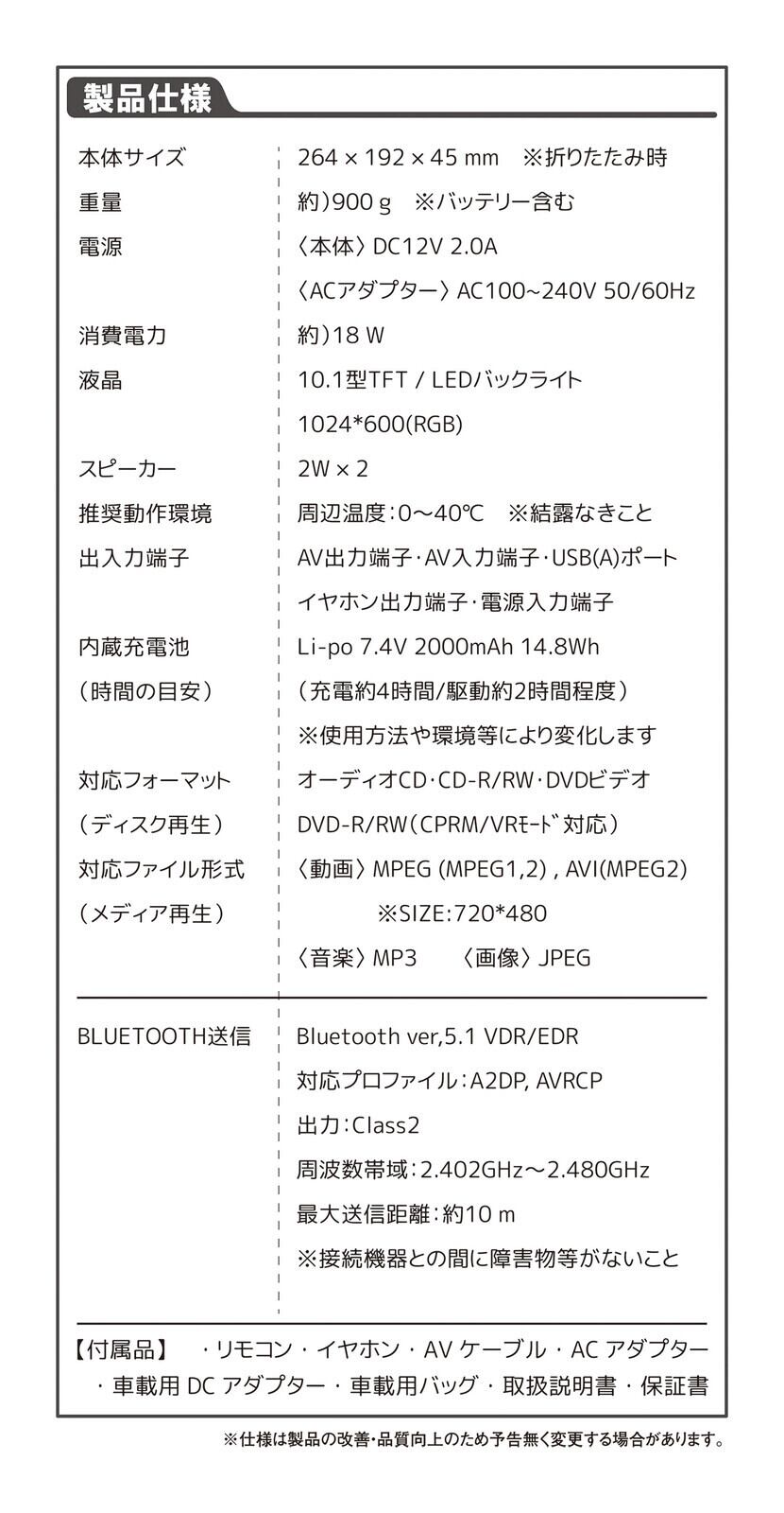 本体, リモコン, イヤホン, AVケーブル, ACアダプター, 車載用DCシガーアダプター, 車載用バッグ, 取扱説明書, 保証書