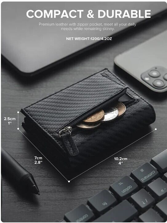 サイズ: 10.2x7x2.5 cm、重量: 120グラム。 背面にジッパー式のコインポケットがあります