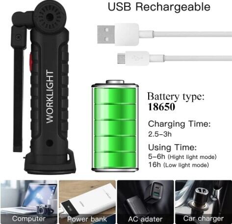 USB充電式で便利なポータブルワークライトです。5つのモード(高/低/ドーム/赤色/赤色点滅)と360°回転機能で、点検や修理、キャンプや釣り、ハイキングなど様々なシーンで活躍。強力磁石とハンギングフックで使い勝手も抜群です。
