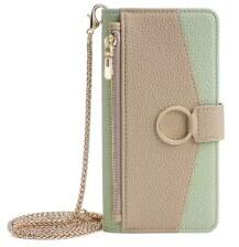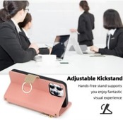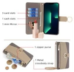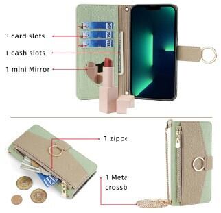 iPhone用PUレザーウォレットケース ミラー カードホルダー キャッシュスロット 財布 メタルストラップ 二重保護 キックスタンド リング おしゃれ ギフト AEX