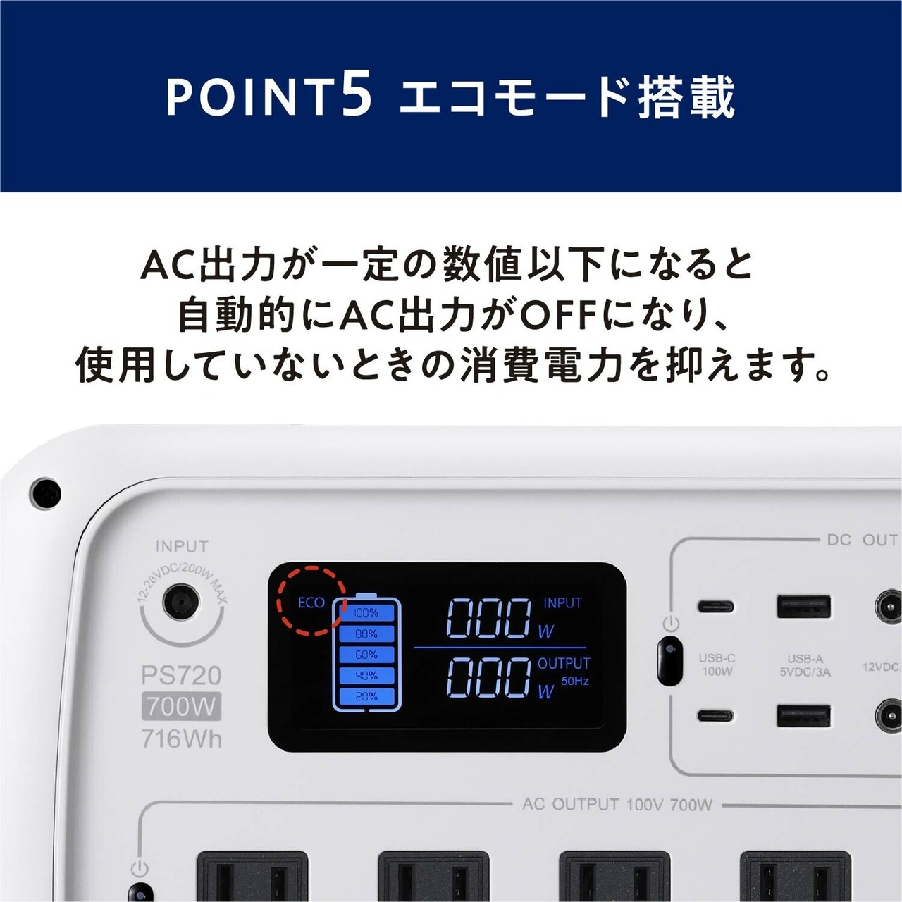 【大口受付中】ポータブル電源 PS720AA 大容量716Wh 定格700W 13出力ポート 長寿命充電池 LEDライト 液晶表示 ECOモード BMS 防災 避難 パーティ キャンプ NS【新品】