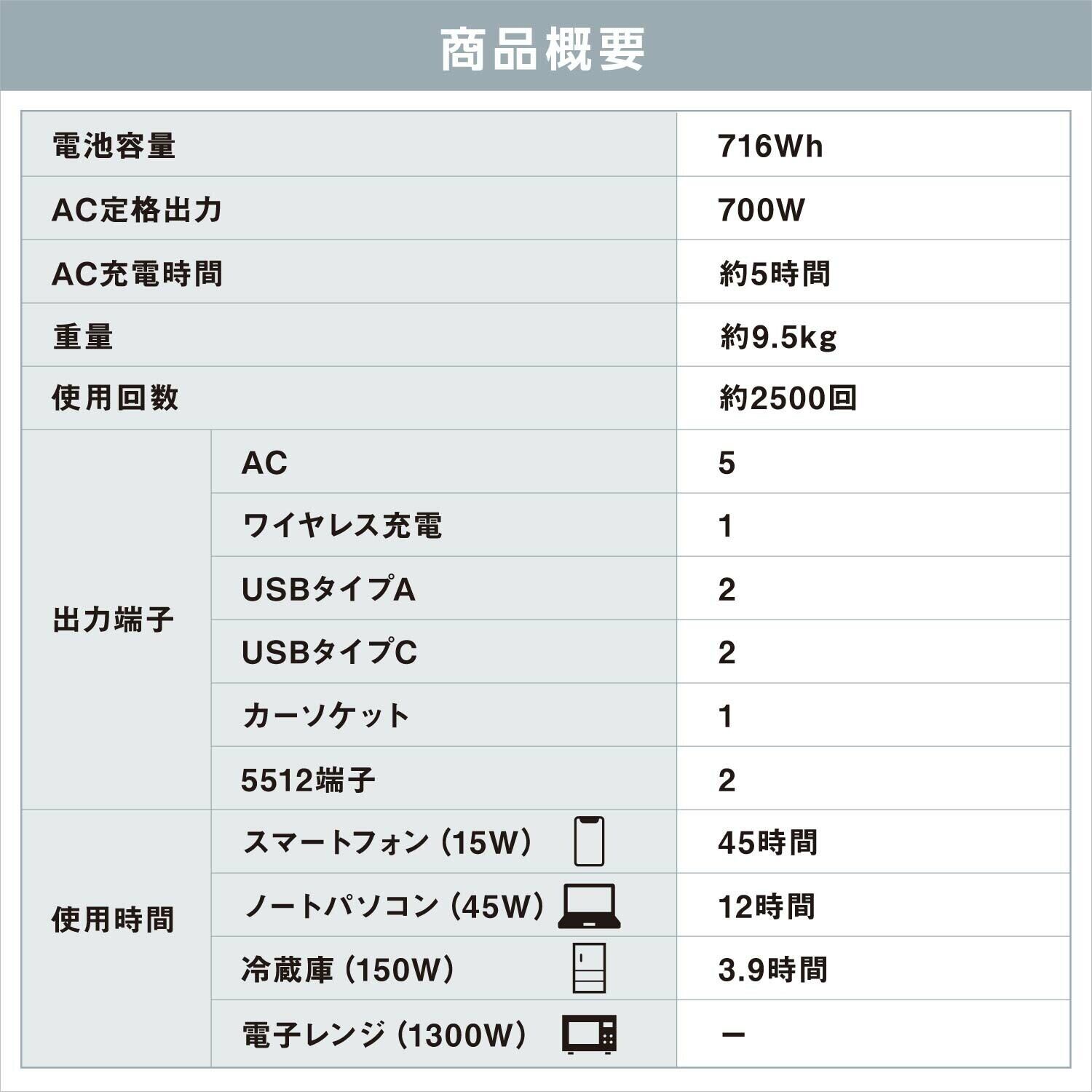 ■出力○AC出力×5ヶ所:100VAC 合計700W○USB-A出力×2ヶ所:5VDC、3A 合計15W○USB-C出力×2ヶ所:5/9/12/15VDC、3A・20VDC、5A 100W○カーソケット×1ヶ所・DC5521ソケット×2ヶ所:12VDC、合計9A、108W○ワイヤレス充電×1ヶ所:5W/7.5W/10W/15W