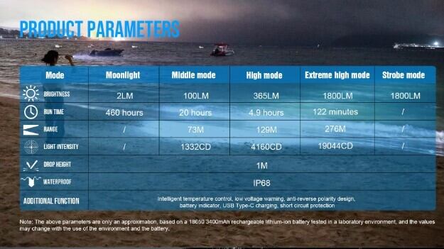 ・驚異の明るさ: 最大1800ルーメンの高輝度で、暗闇でも視界をしっかり確保。最長276メートルの照射距離で広範囲を照らします。