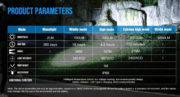 ・驚異の明るさ: 最大2350ルーメンの高輝度で、暗闇でも視界をしっかり確保。最長310メートルの照射距離で広範囲を照らします。
