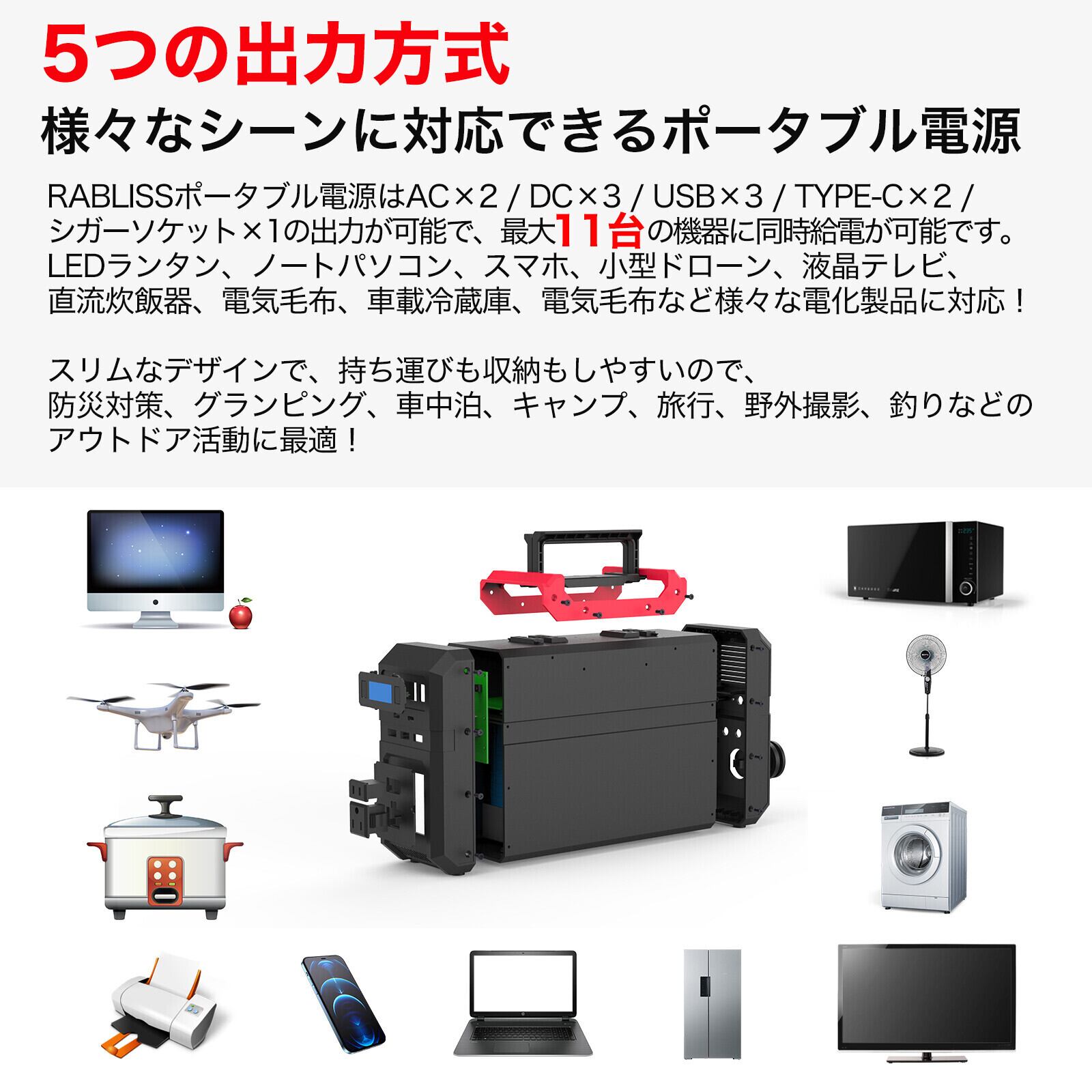 AC×2 / DC×3 / USB×3 / TYPE-C×2 / シガーソケット×1出力を通じて、