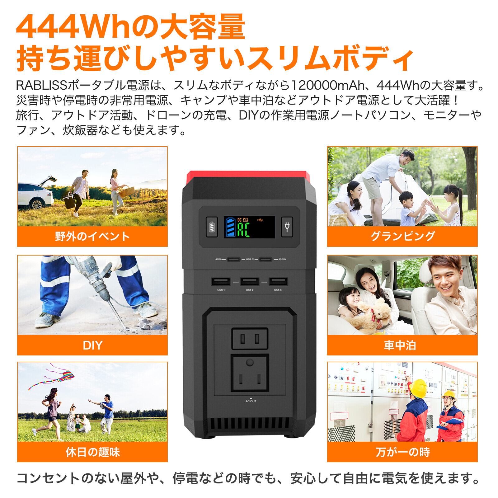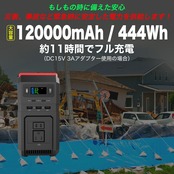 ポータブル電源 超大容量 120,000mAh、444Wh 家庭用蓄電池 1年保証 PSE認証済 純正弦波 アウトドア ポータブルバッテリー PSE認証 DIY 停電 車中泊 オフィス 非常用電源 SD