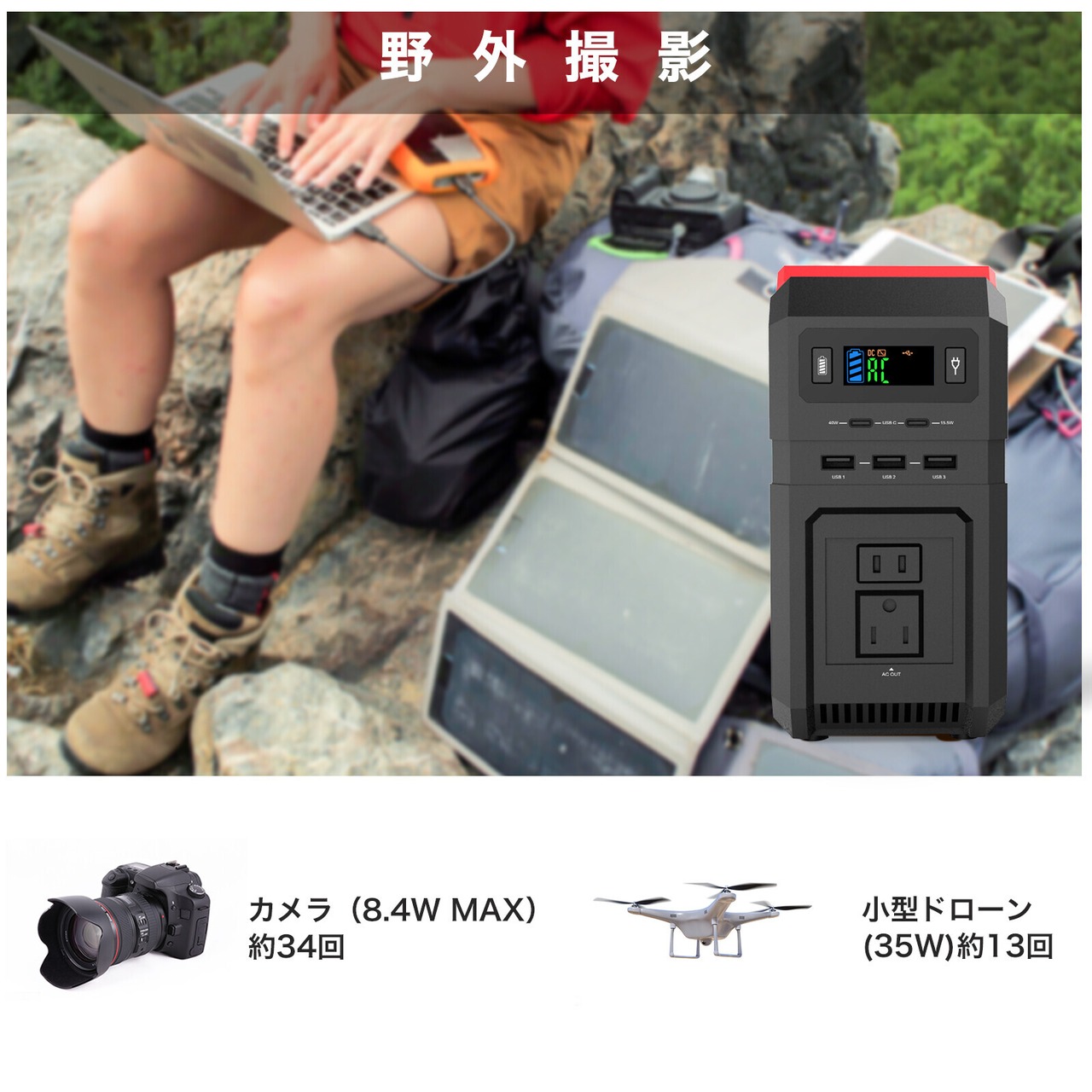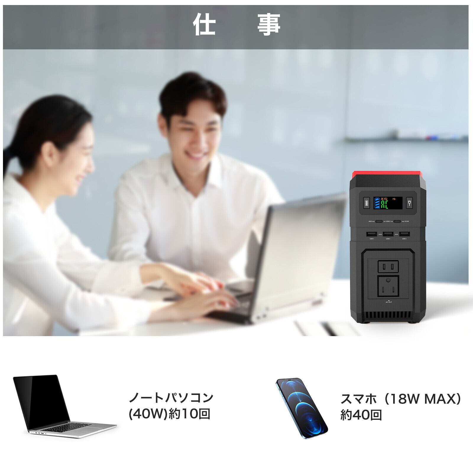 家庭コンセント、ソーラーパネル、シガーソケット、ジェネレーターから手軽に充電できます!いつでもパワフルな状態に!