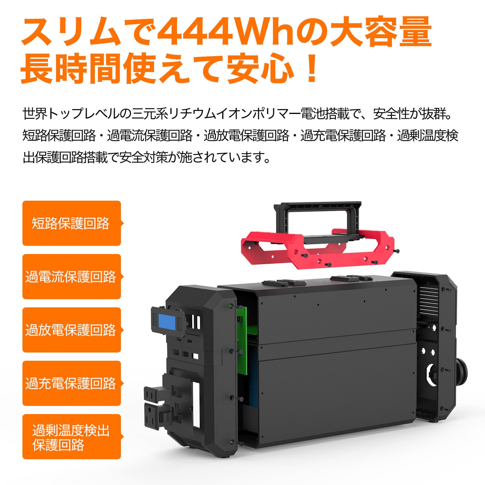 過電流保護、過電圧保護、過充電保護、過放電保護、過熱保護、短絡保護、安全性抜群です!