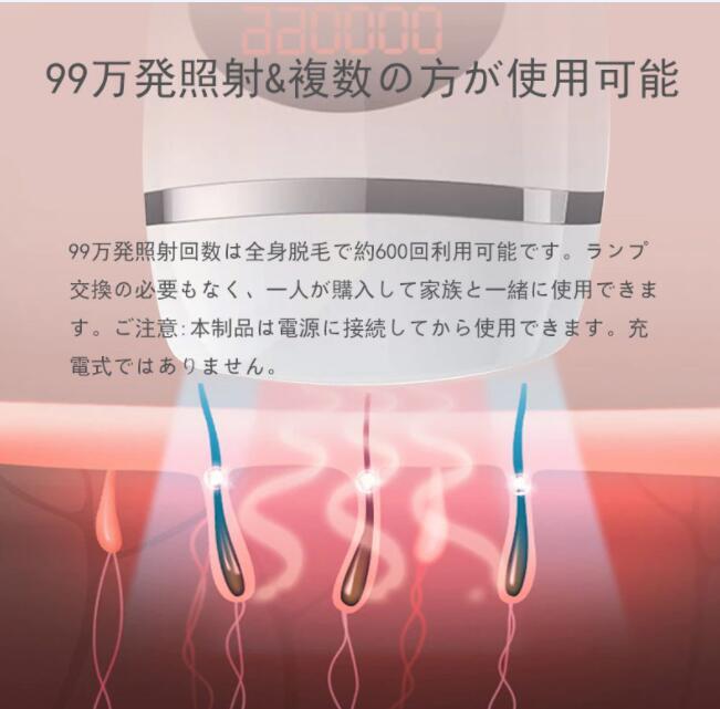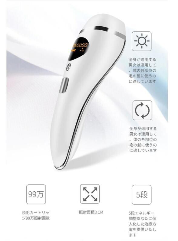 高出力: 99万発照射、5段階レベル調整可能で、様々な肌質に対応。