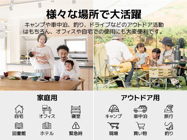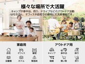 家庭用コンセント、シガーソケット、専用バッテリーに対応しており、室内はもちろん、室外、車内でもご使用頂けます。