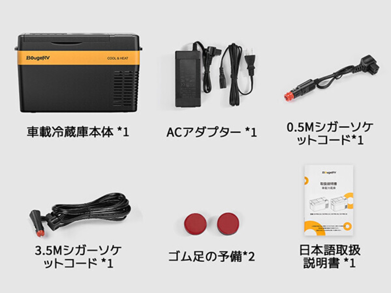 家庭用ACアダプター、3.5m車載用DC電源コード、0.5mバッテリー接続用DCケーブル、日本語説明書×1、予備ゴム足×2