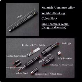 機能:懐中電灯、ガラス破り、栓抜き、ペン、ドライバー、のこぎり、スタイラスペン