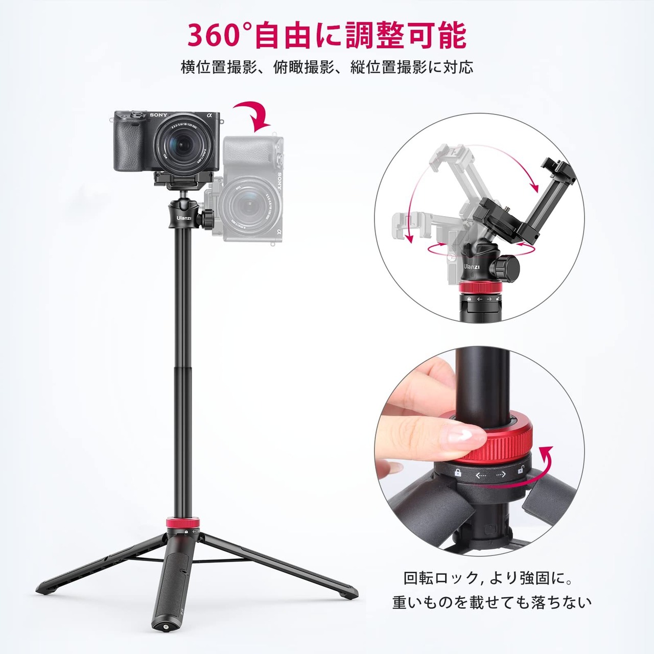 ・360度回転: ボール雲台により、自由な角度での撮影が可能。